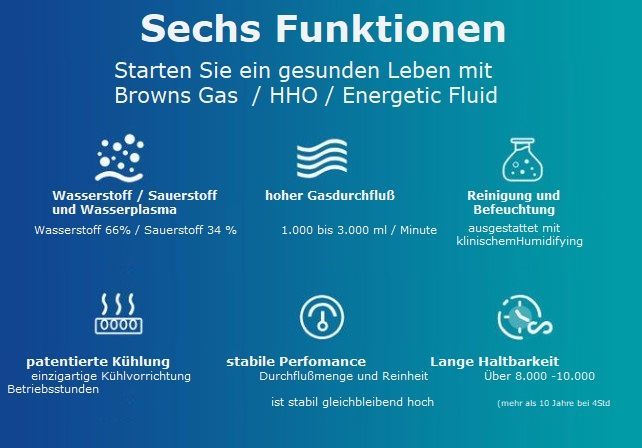 Browns Gas überzeugt dadurch, dass es sanfter ist als H2 und durch das Wasserplasma einen zusätzlichen Effekt, der die Zellen zu einer höheren Eigenschwingung bringt. Deshalb ist nach den vielen Jahren Erfahrung mit den neben stehenden Marken erforderlich, eine hohe Menge an Energetic Fluid zu bekommen, da 400 bis 800 ml oft nicht ausreichen oder zu Problemen führten.